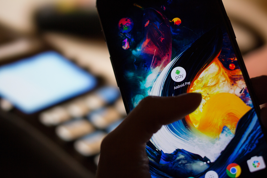 Russia Moscow May 23 2017. Application on the smartphone screen. Payment service Android Pay will work in Russia on May 23